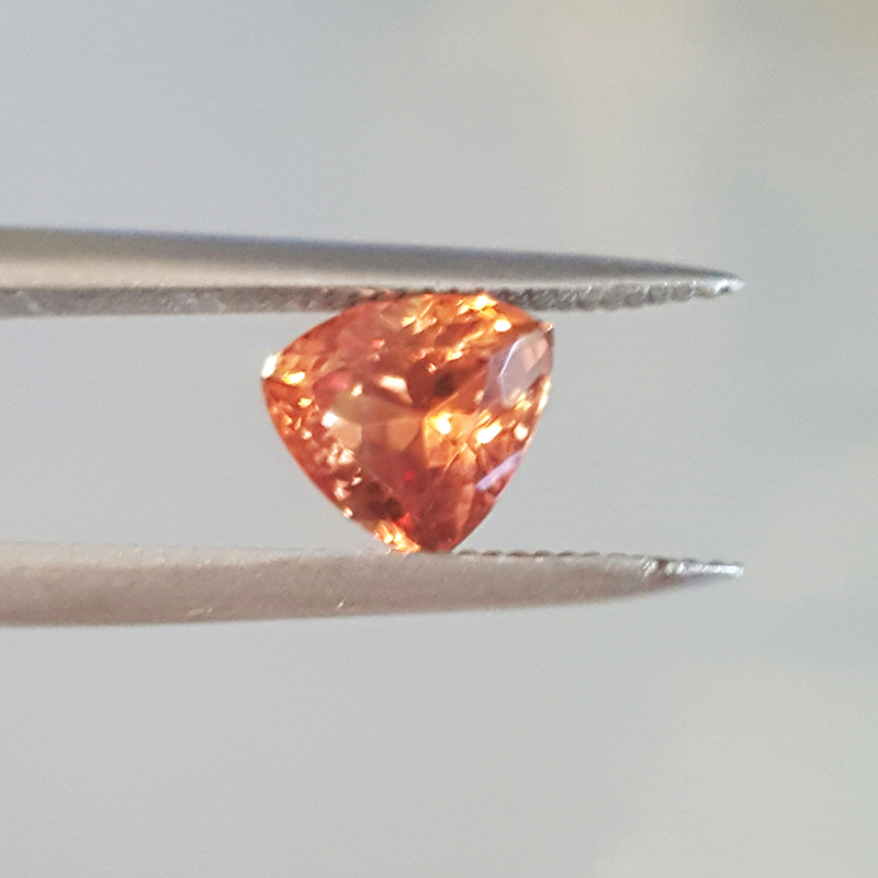 Natural untreated trillion orange sapphire from the Umba River Valley in Africa. This super lively unheated orange sapphire trillion has bright flashes of orange and peach. If you need an one carat orange sapphire triangle shape this one is a beauty!